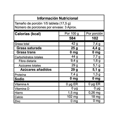 Ingredientes: Masa de cacao, azúcar de caña, manteca de cacao, emulsionante (lecitina de soja) y extracto de vainilla.