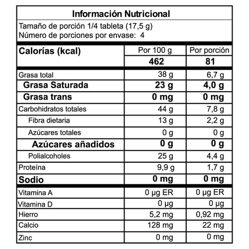 Su sabor redondo y aromático la convierte en la elección perfecta para quienes buscan un chocolate saludable y gourmet, sin azúcar refinada y naturalmente libre de gluten. Ideal para acompañar un buen café, maridar con vino tinto o disfrutar con frutos secos.