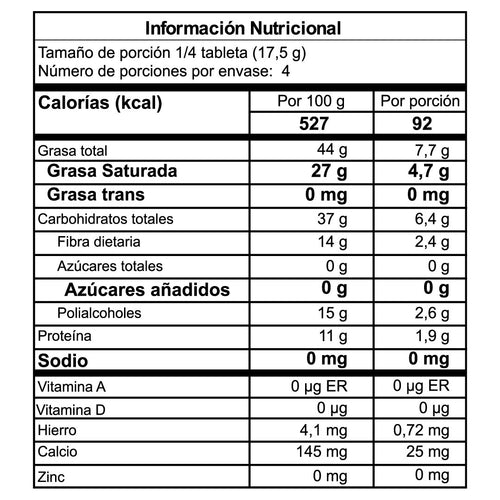 Perfecta para quienes buscan un chocolate saludable y de calidad premium, sin azúcar refinada y naturalmente libre de gluten. Su perfil intenso, con toques amargos y notas aromáticas, la convierte en la compañía ideal para un buen café, un vino tinto o un mix de frutos secos.