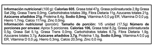 Ingredientes: Masa de cacao, manteca de cacao, azúcar de caña, emulsionante (lecitina de soya).