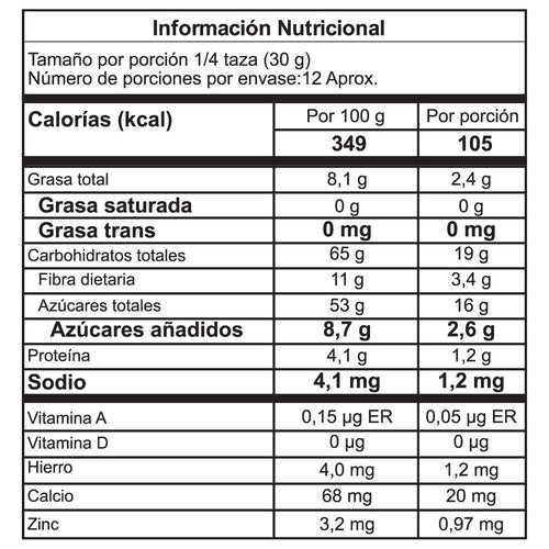 Ingredientes: Hojuela de avena, miel natural, semilla de linaza, canela en polvo, arándanos deshidratado, fresa deshidratada y mora deshidratada.